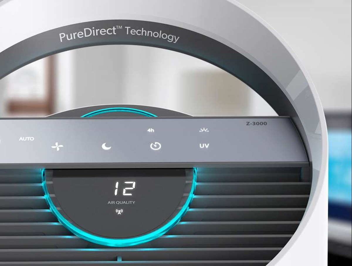 PureDirect teknolig distribuerar luften mer effektivt. Med den här teknologin som använder två luftströmmar distribueras luften längre och jämnare i hela rummet. 360 gradigt partikel luftfilter fångar föroreningar och ett kolfiber förfilter tar bort VOC gaser och lukter från alla håll. UV-C lampan dödar de bakterier som fastnar i filtret. Idealisk för rum upp till 23 kvadrat med Clean Air Delivery Rate (CADR) och värden på 164m3/h (Pollen), 143m3/h (Damm) and 95m3/h (Rök). En touchknapp kontrollerar fläktens hastighet, UV-inställning och filterbyte indikator. Modern design som passar i alla miljöer. Lätt att flytta med ett smidigt inbyggt handtag.