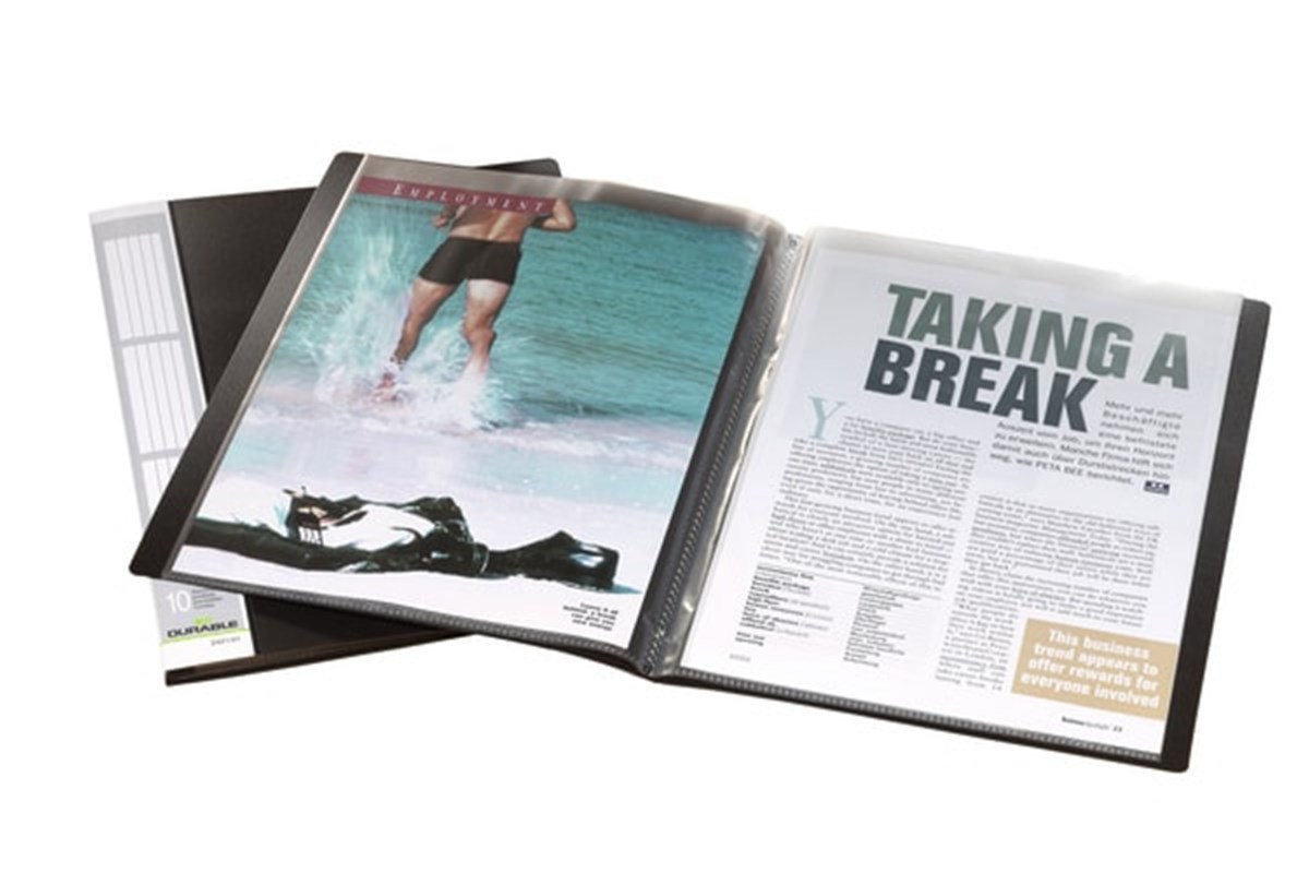 Demonstrations- och presentationspärm i polypropylen med fastsvetsade kopiesäkra fickor för A4. Istoppsficka på ryggen med instick för uppmärkning. Svart.