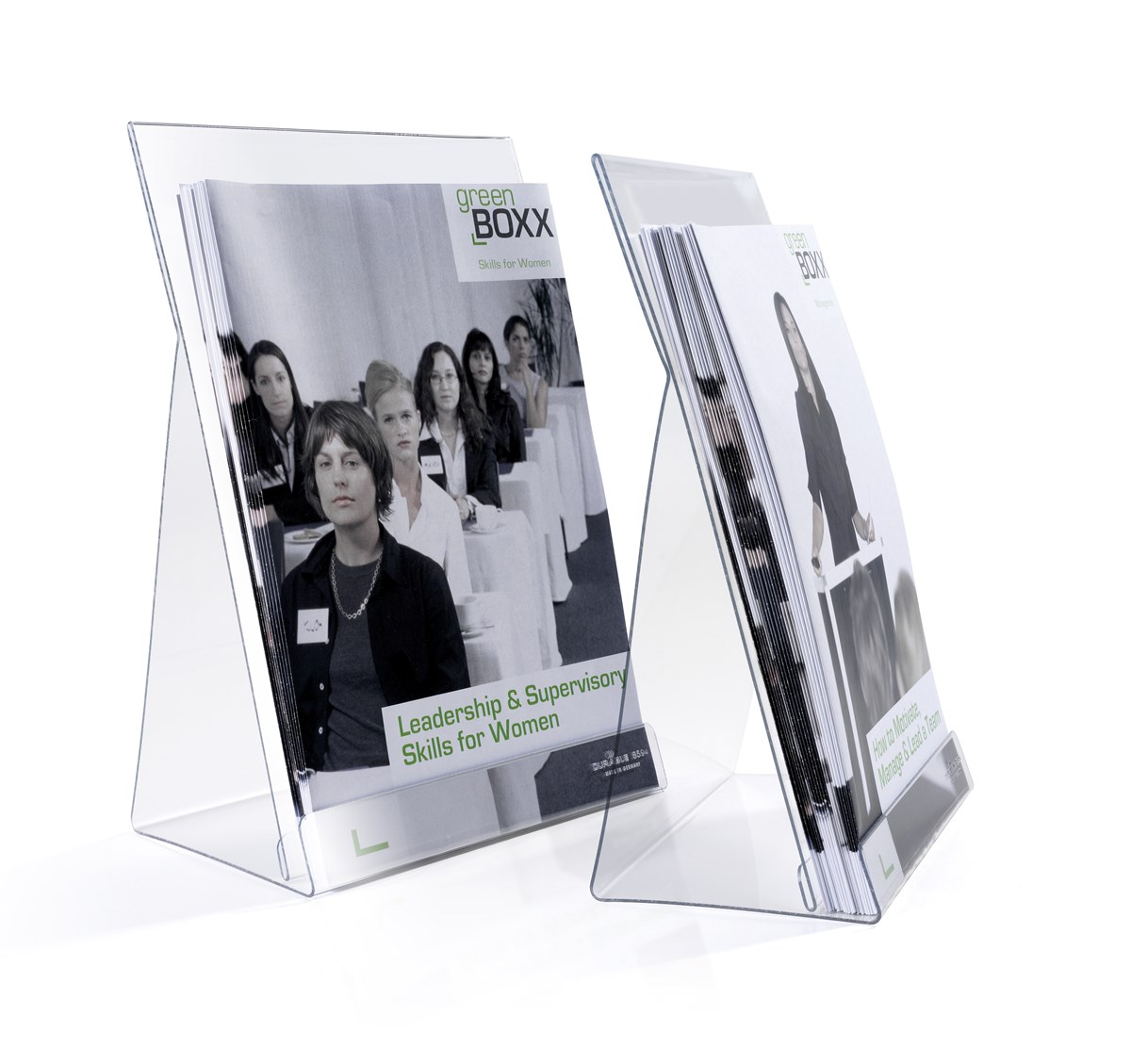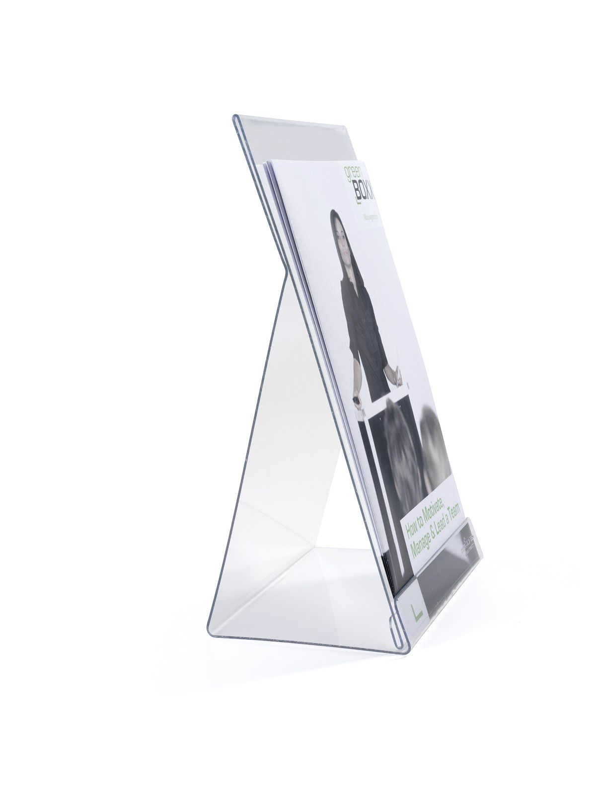 Broschyrställ av transparent polystyrenplast för receptioner, utställningslokaler, mässor m.m. Materialet kläms fast på framsidan, titelsidan kan skjutas in bakom för att ange vilken broschyr som ska finnas i stället. 2 st/förp.