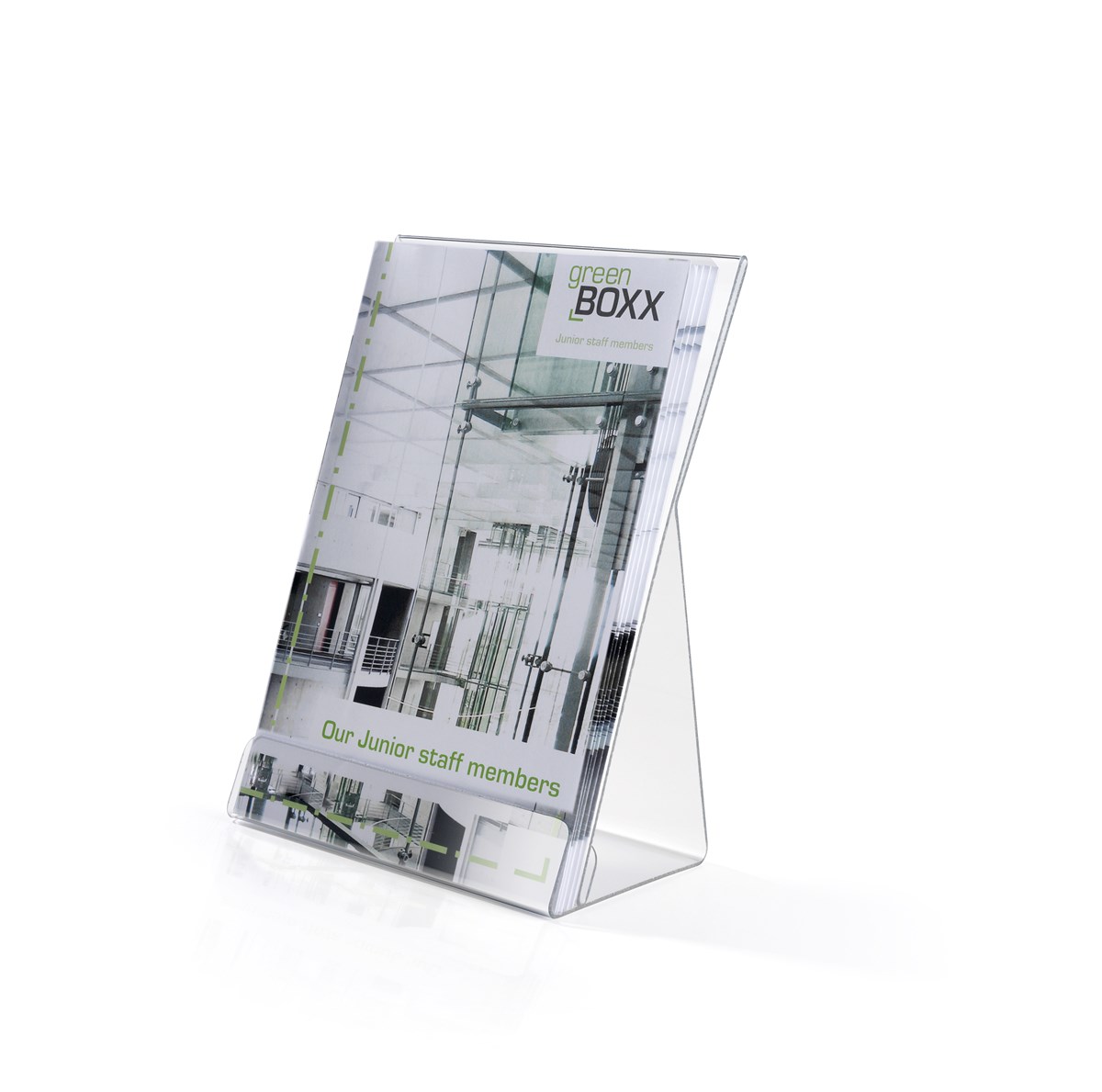 Broschyrställ av transparent polystyrenplast för receptioner, utställningslokaler, mässor m.m. Materialet kläms fast på framsidan, titelsidan kan skjutas in bakom för att ange vilken broschyr som ska finnas i stället. 2 st/förp.