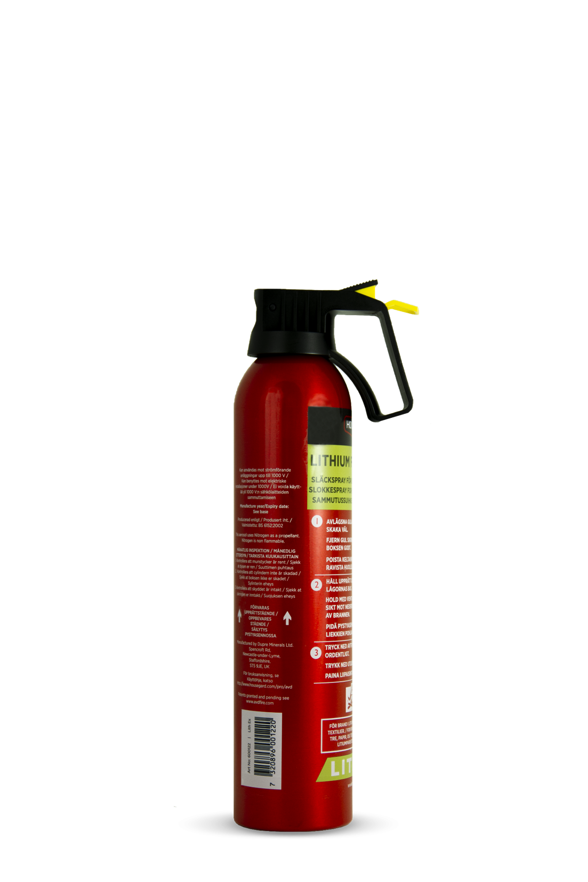 En unik släckspray speciellt framtagen för att bekämpa litiumjonbatteribränder av begränsad storlek. Släcksprayen använder det nya och revolutionerande släckmedlet AVD. Säkra för användning i elektrisk utrustning. Släcker klass A-bränder. 500 ml.