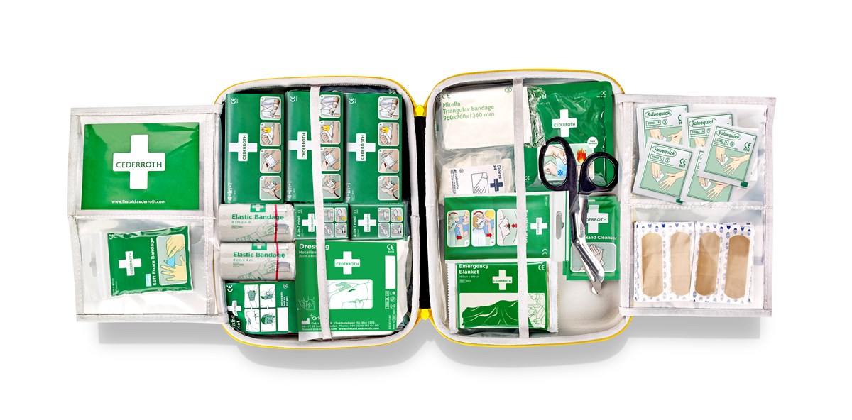 Innehåll: - 3 Cederroth 4-i-1 blodstoppare - 2 Cederroth 4-i-1 mini blodstoppare - 20 Salvequick plastplåster - 10 Salvequick Sårtvättare - 1 Soft Foam Bandage 6 cm x 40 cm - 1 Andningsmask - 2 Safety Hand Cleanser - 2 par handskar - 1 Räddningsfilt - 2 Elastiska bindor - 2 Metalliserade kompresser 20x40 cm - 1 Fästnät - 1 Cederroth Burn Gel Dressing 1 Mitella 1 Sax - 1 Första Hjälpen-instruktion