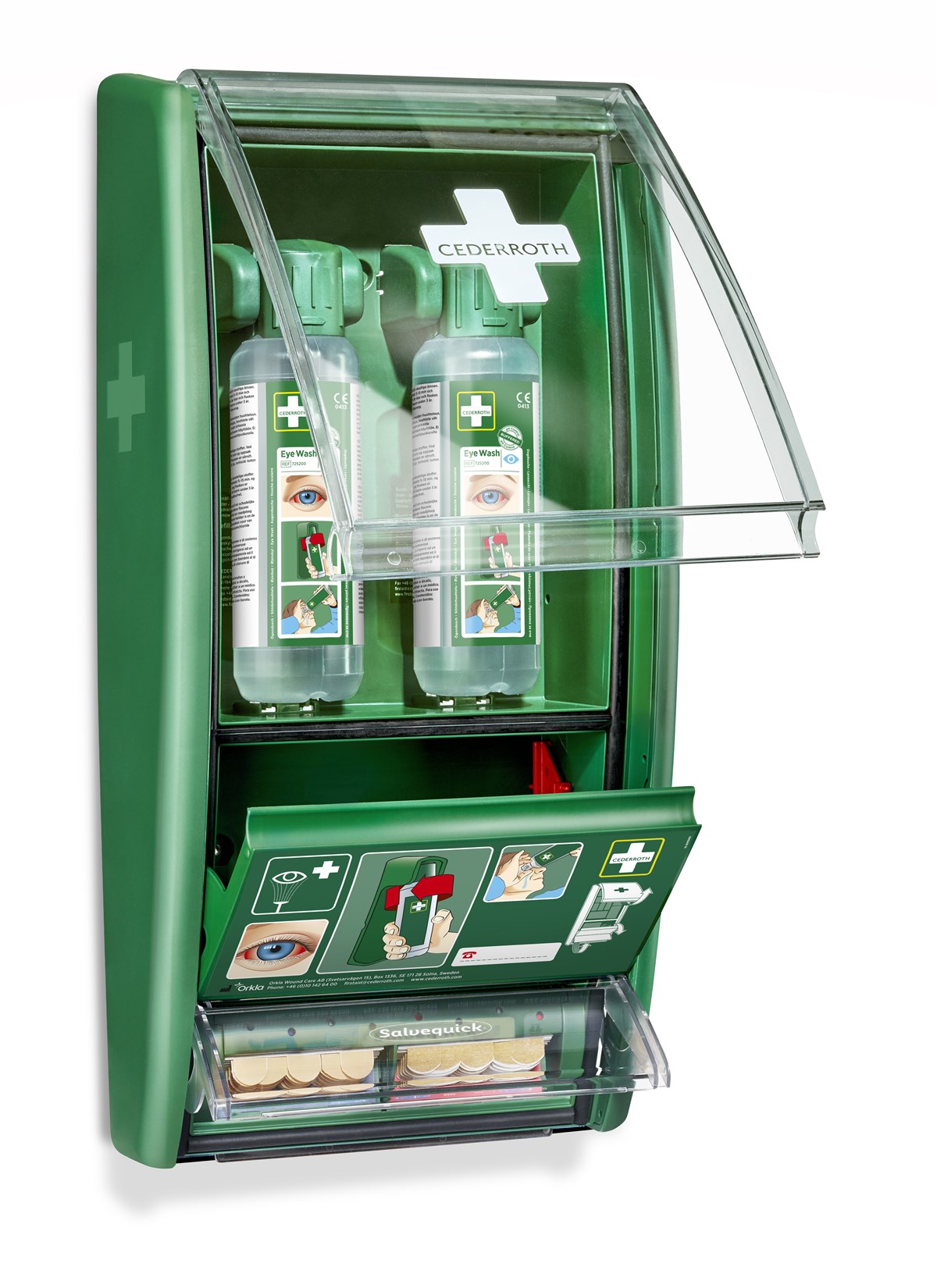 - 2 st Cederroth Ögonduschflaskor à 500 ml - 1 st Salvequick Plåsterautomat inkl. 40 st textilplåster och 45 st plastplåster - Ögonduschinstruktion - 1 st nyckel