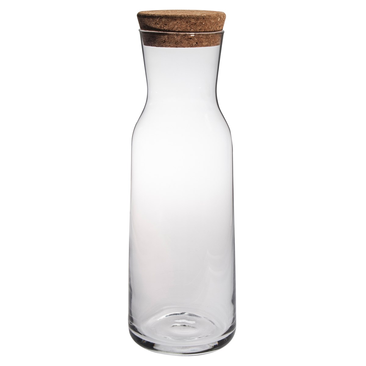 Glaskaraff med lock i kork. Locket kan förses med tryck. Rymmer 1 liter. Höjd 26,5 cm, diameter 9,5 cm.