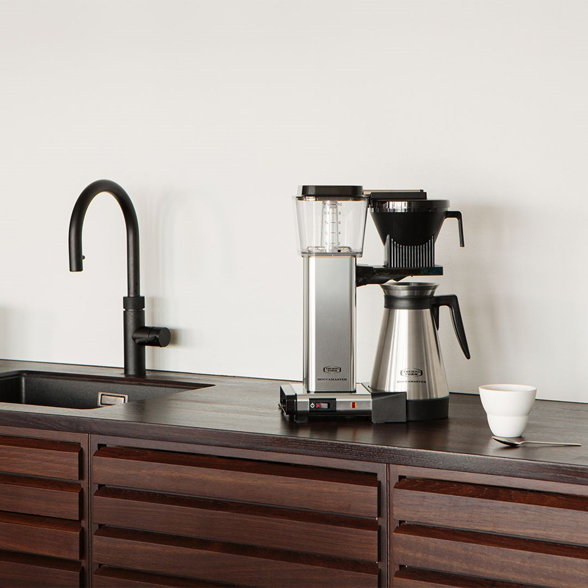 Snabb och tyst bryggare med rostfri ståltermos. Brygger 10 koppar (1,25 liter) på 6 minuter. Droppstopp. De effektiva värmeelementen värmer snabbt upp vattnet till den idealiska bryggtemperaturen på 92–96 grader. Certifierad med Guldbönan, vilket innebär att den uppfyller de högsta europeiska kraven för kaffebryggning. 5+5 års garanti för privatpersoner, 1 år för företag.