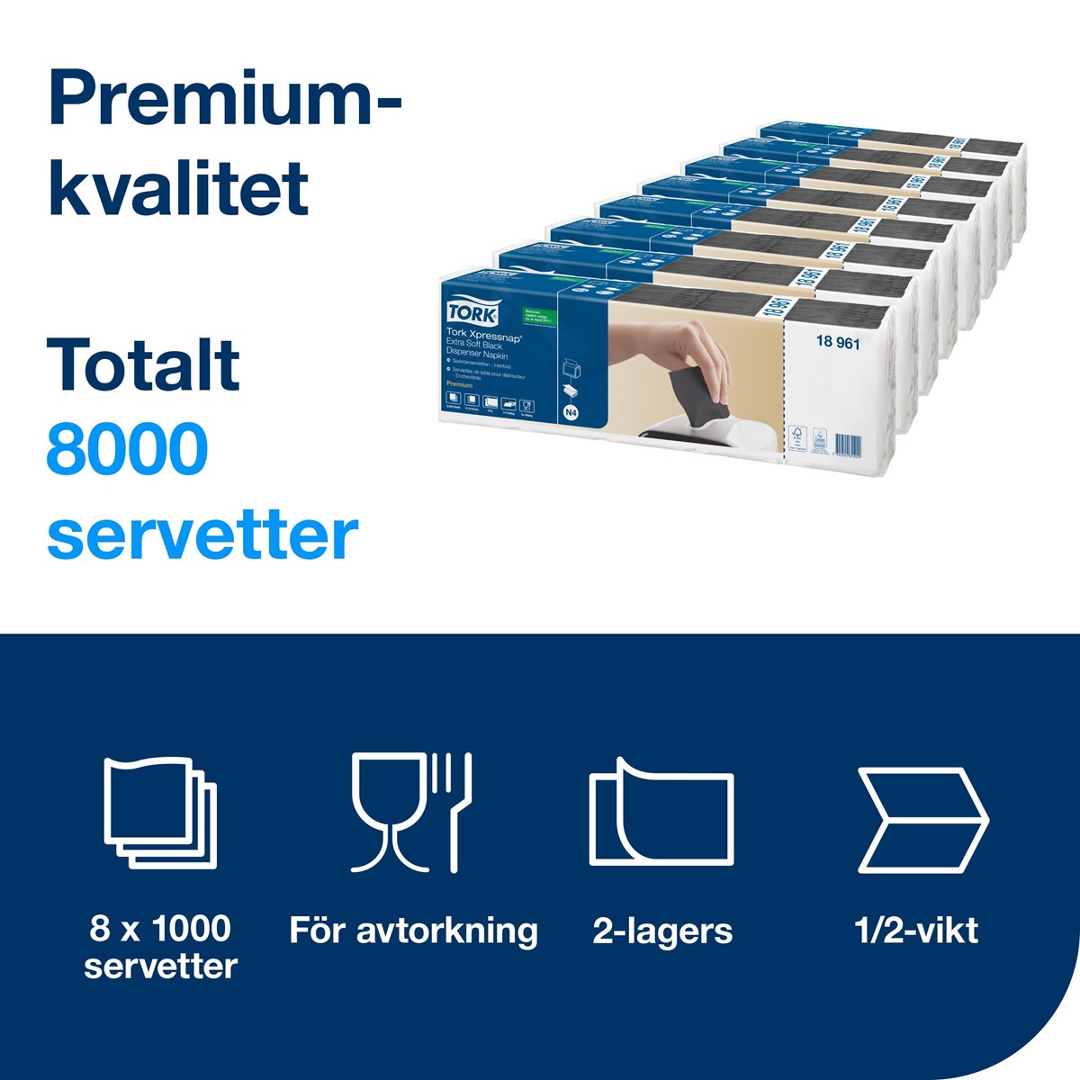 Svarta, extra mjuka servetter av högsta kvalitet (Premium). Ligger vikta så att nästa ark automatiskt dras fram och ligger kvar för nästa person. 1/2-vikta, 2-lags. Format: 16,5 x 21,3 cm. 1000 st/förp. 8 förp./kartong.