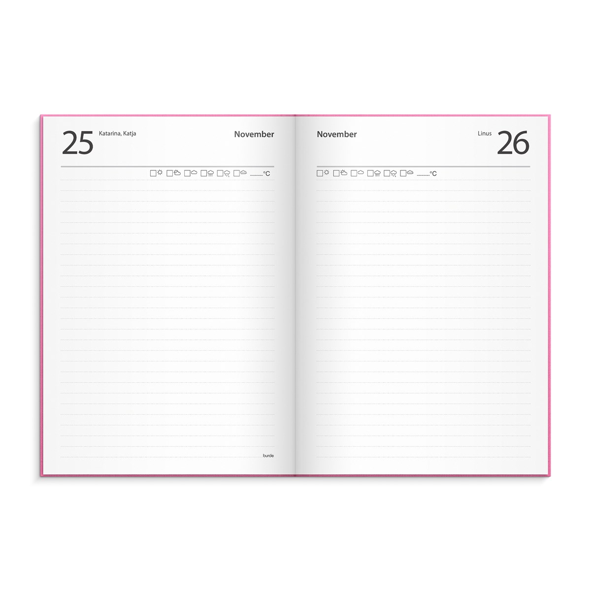 Dagbok som sträcker sig över ett år, årsneutral. Namnsdagsregister. Inbunden. Format: 142x205 mm.