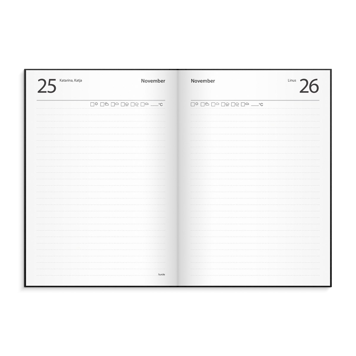 Dagbok som sträcker sig över ett år, årsneutral. Namnsdagsregister. Inbunden. Format: 142x205 mm.