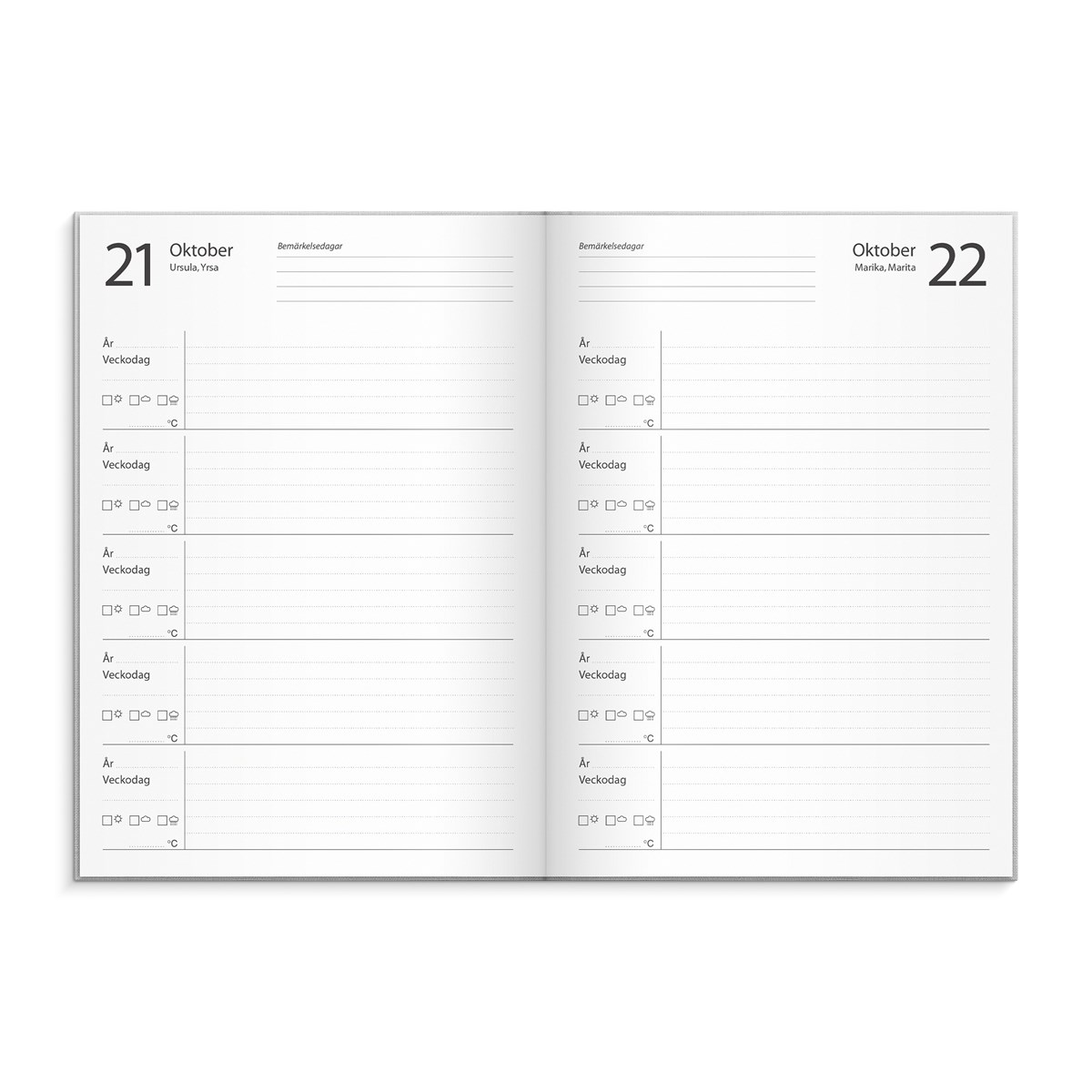 Dagbok som sträcker sig över fem år, årsneutral. Namnsdagsregister. Inbunden. Format: 142x205 mm.
