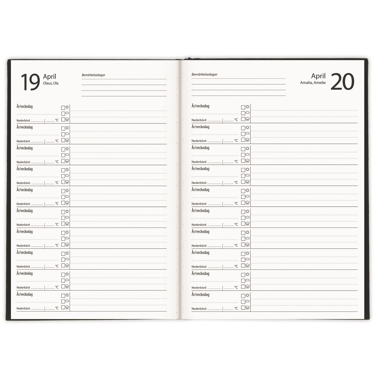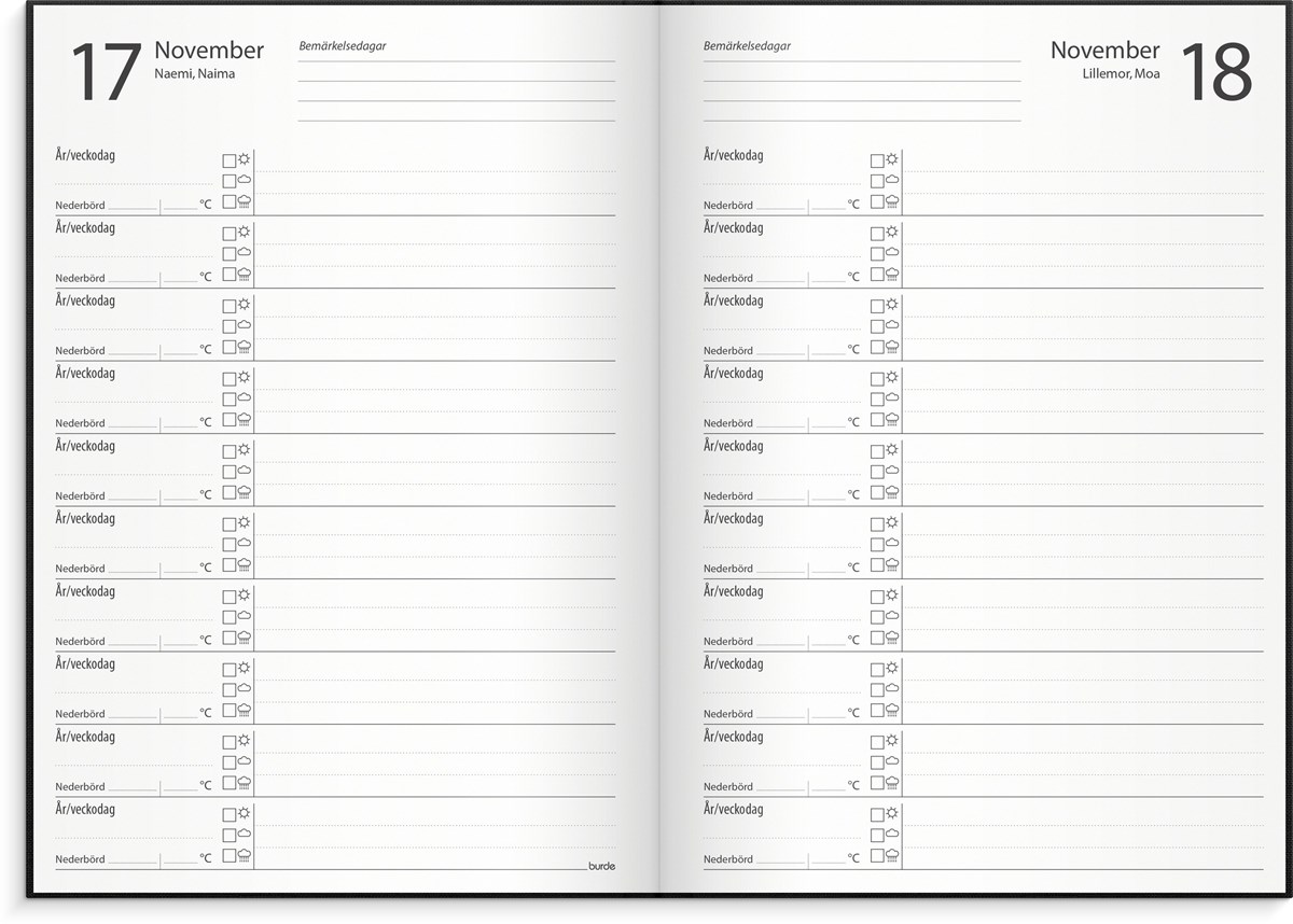 Årsneutral dagbok som sträcker sig över tio år. Inbunden. Namnsdagsregister. Svart linnetextil. Format: 142 x 205 mm.