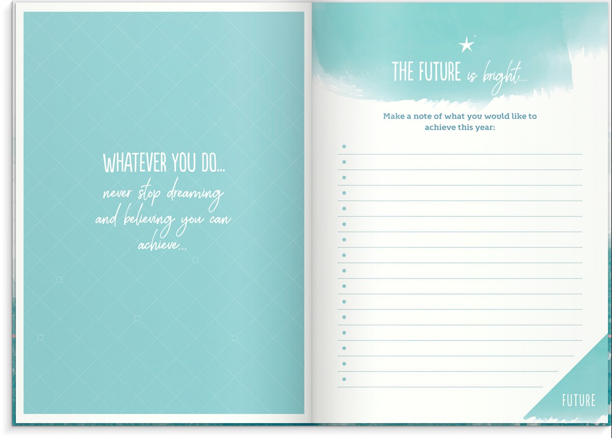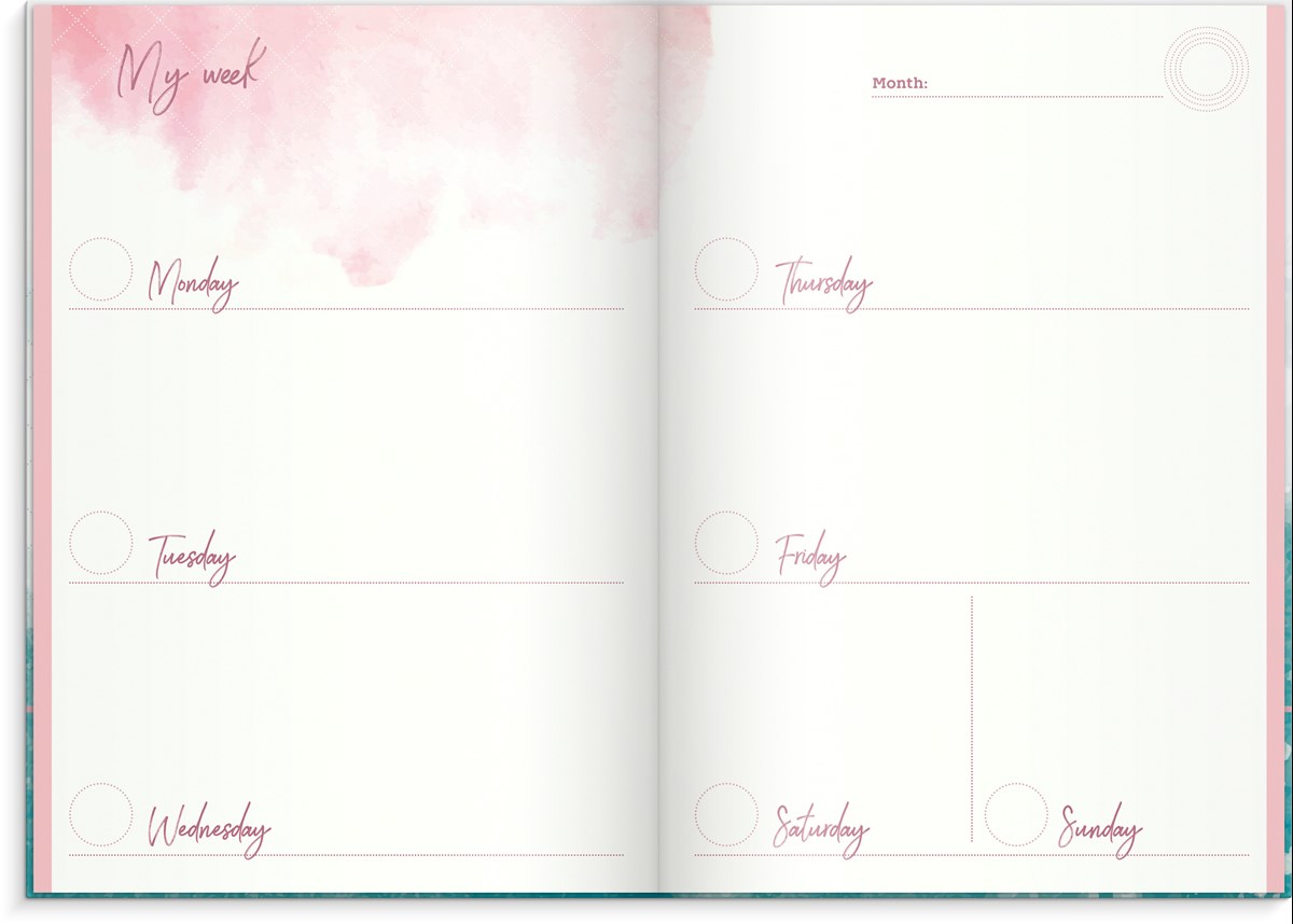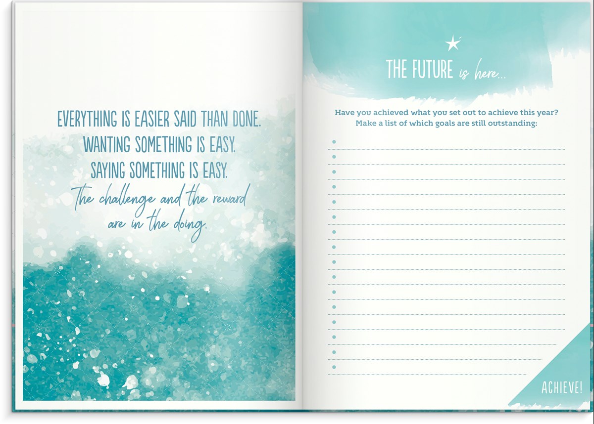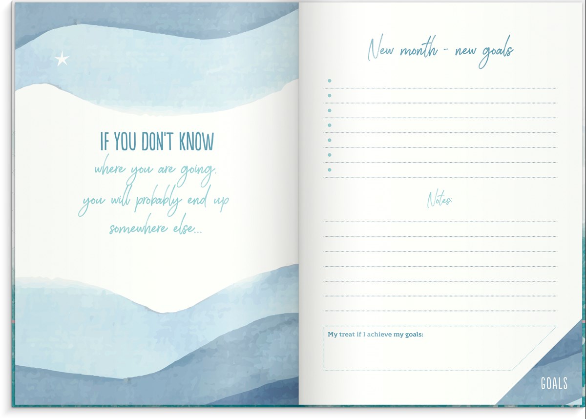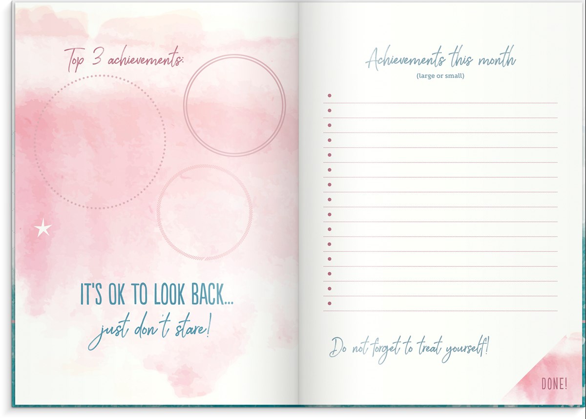 Inbunden odaterad kalender med rosa märkband och hårt omslag i kartong. Ett planeringsverktyg för att uppnå sina drömmar och mål. Kalendern innehåller sidor med inspirerande citat, plats för mål, reflektioner och anteckningar. Skriv ner års- och månadsmål. Efter varje månadsslut finns en sida för utvärdering av månaden som gått. Engelsk inlaga. 100 g cremefärgat papper, 128 blad (256 sidor). FSC®-papper. Format: 165x233 mm.