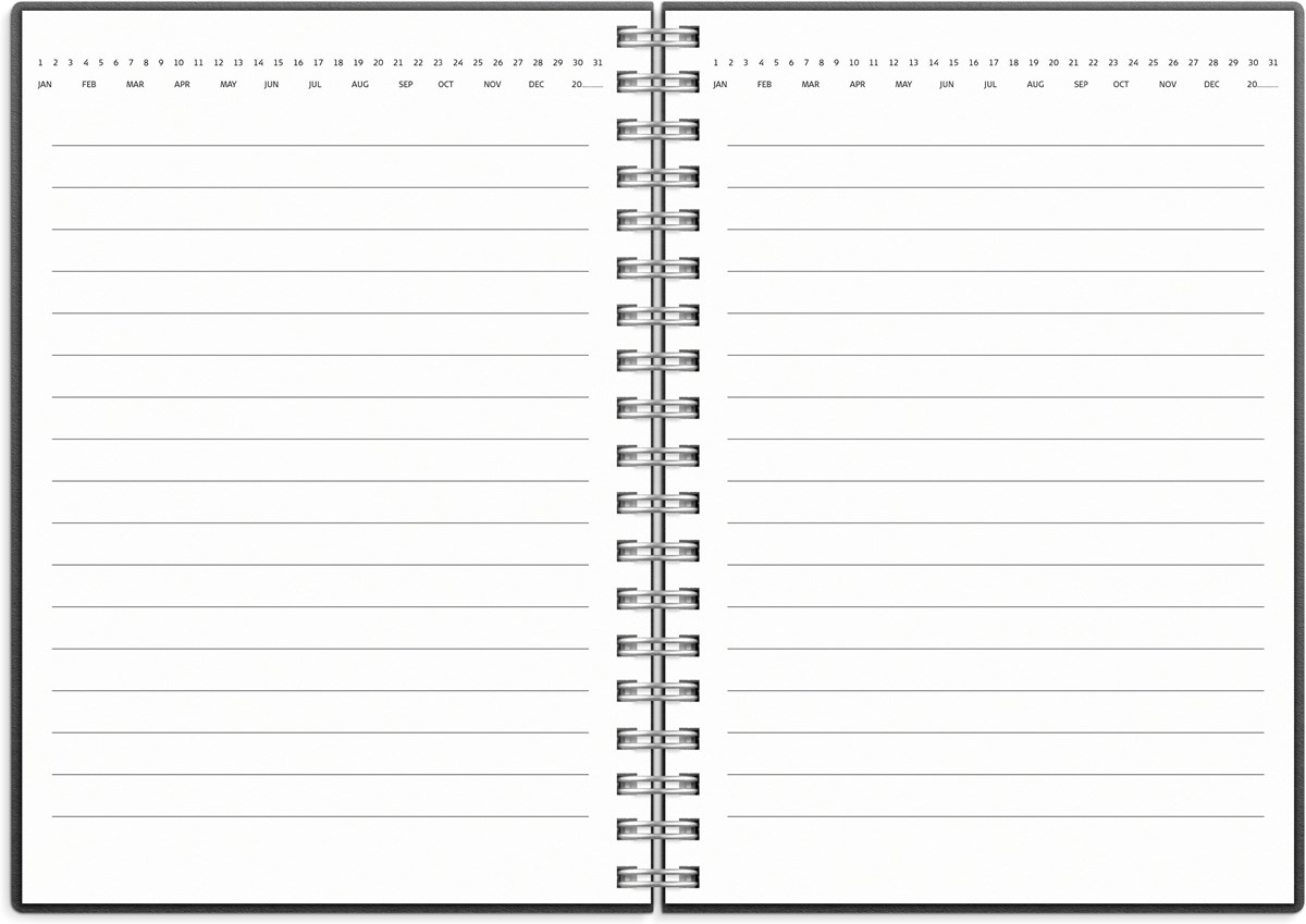Omslag i kartong. Linjerad, datumrad, 80g, 80 blad. Spiralbunden. Passar Lilla Noteskalendern. Format: A6.