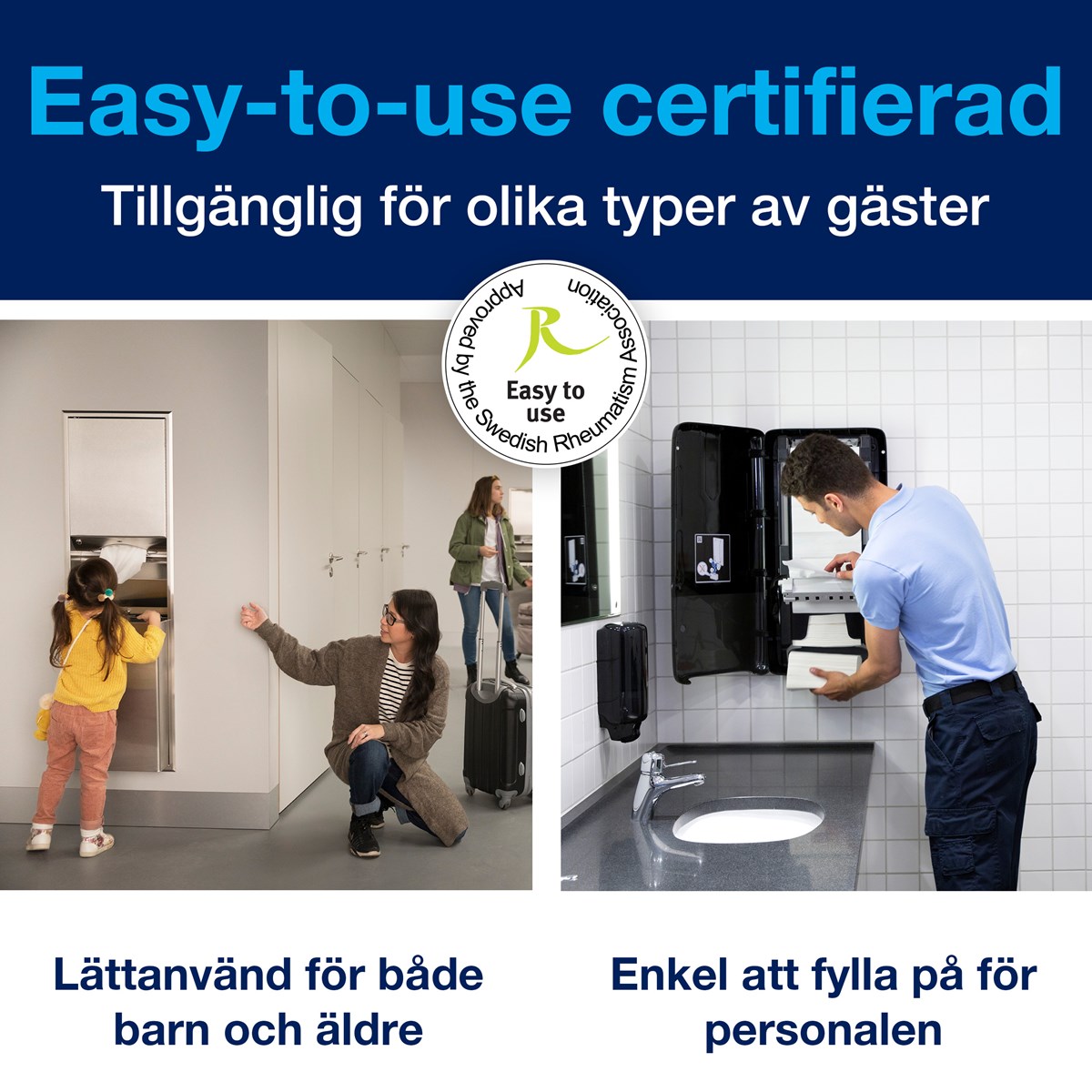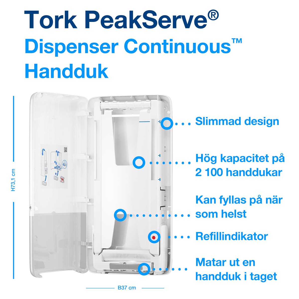 Utformad för högtrafikerade toalettutrymmen. Rymmer 2100 handdukar. Snabb utmatning och enkel att fylla på. Refillindikator visar när det finns en halv bunt kvar (ca 200 handdukar). Mått: (H x B x D) 73 x 37 x 10 cm.
