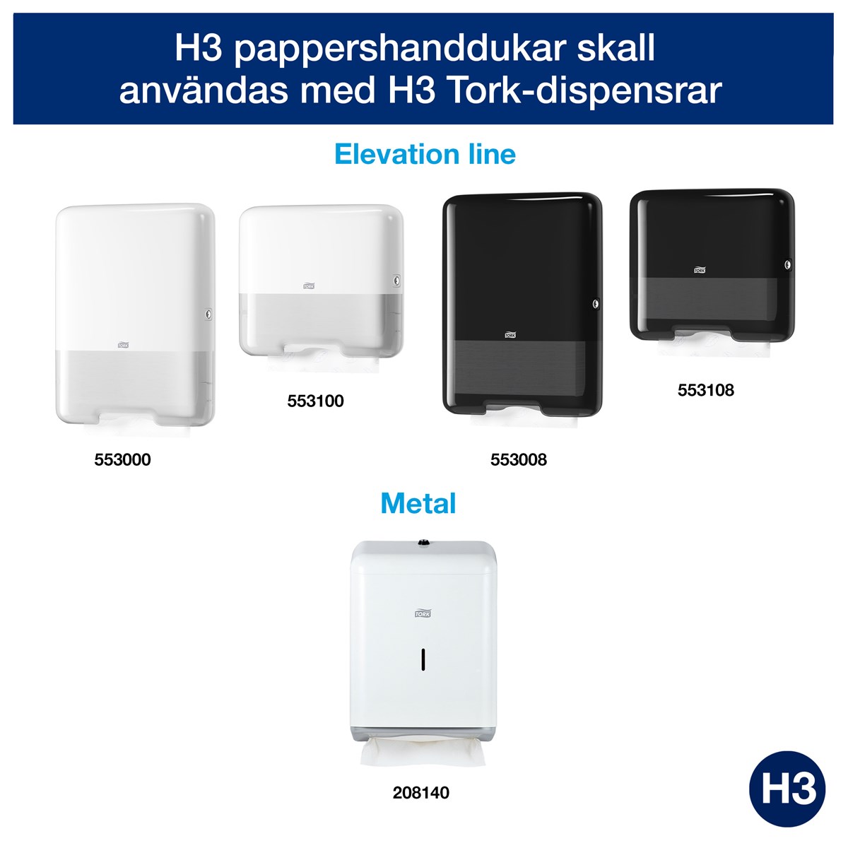 Pappershanddukar av hög kvalitet (Advanced). Vit, 2-lag. Mått: 24,8 x 23 cm. 250 st/bunt, 3750 st/förp. Passar till Tork hållare H3.