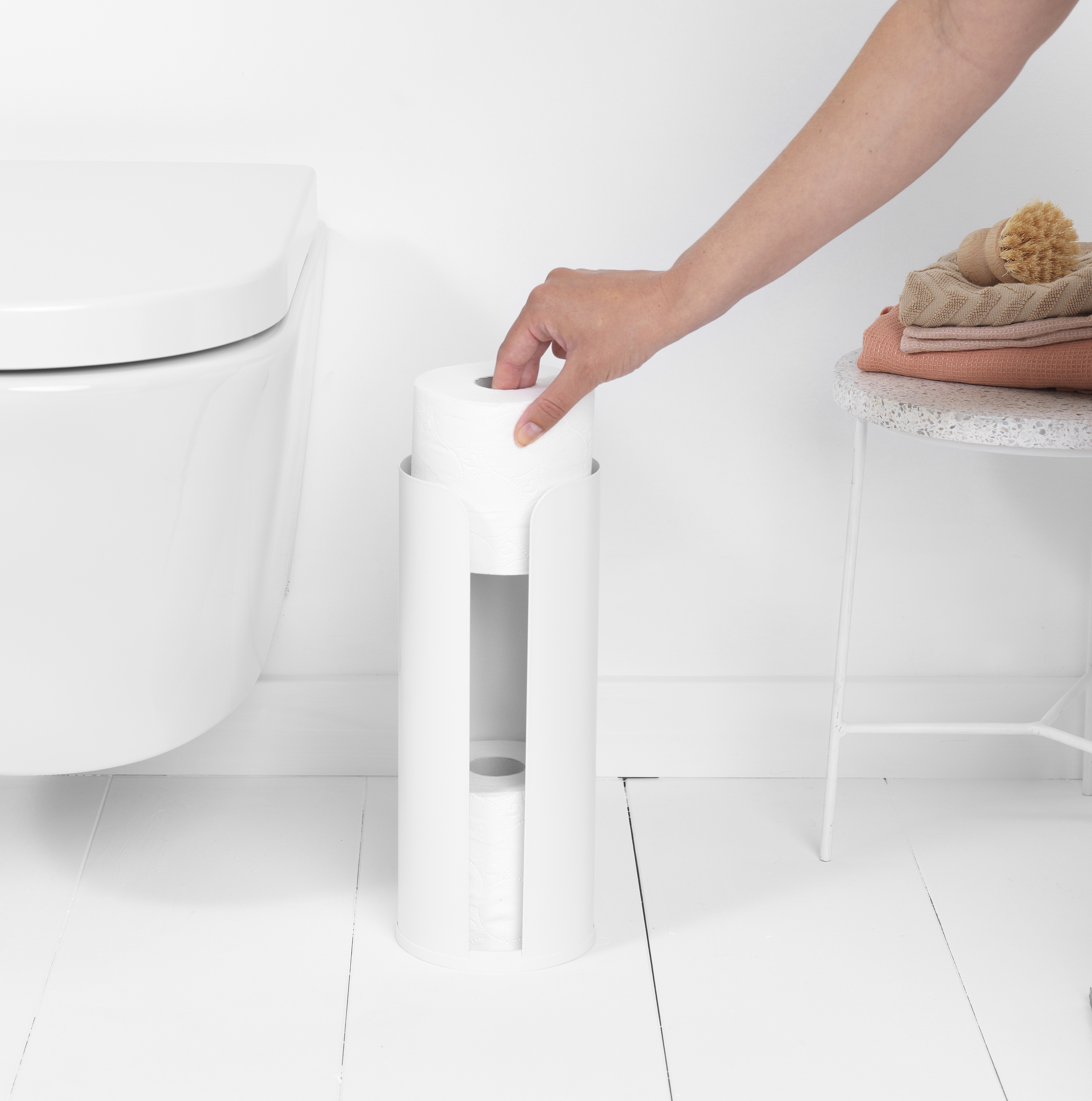 Fristående och utformad för att rymma 3 extra toalettrullar. Tack vare dess stängda design skyddas rullarna från damm och vattenstänk. 10 års garanti.