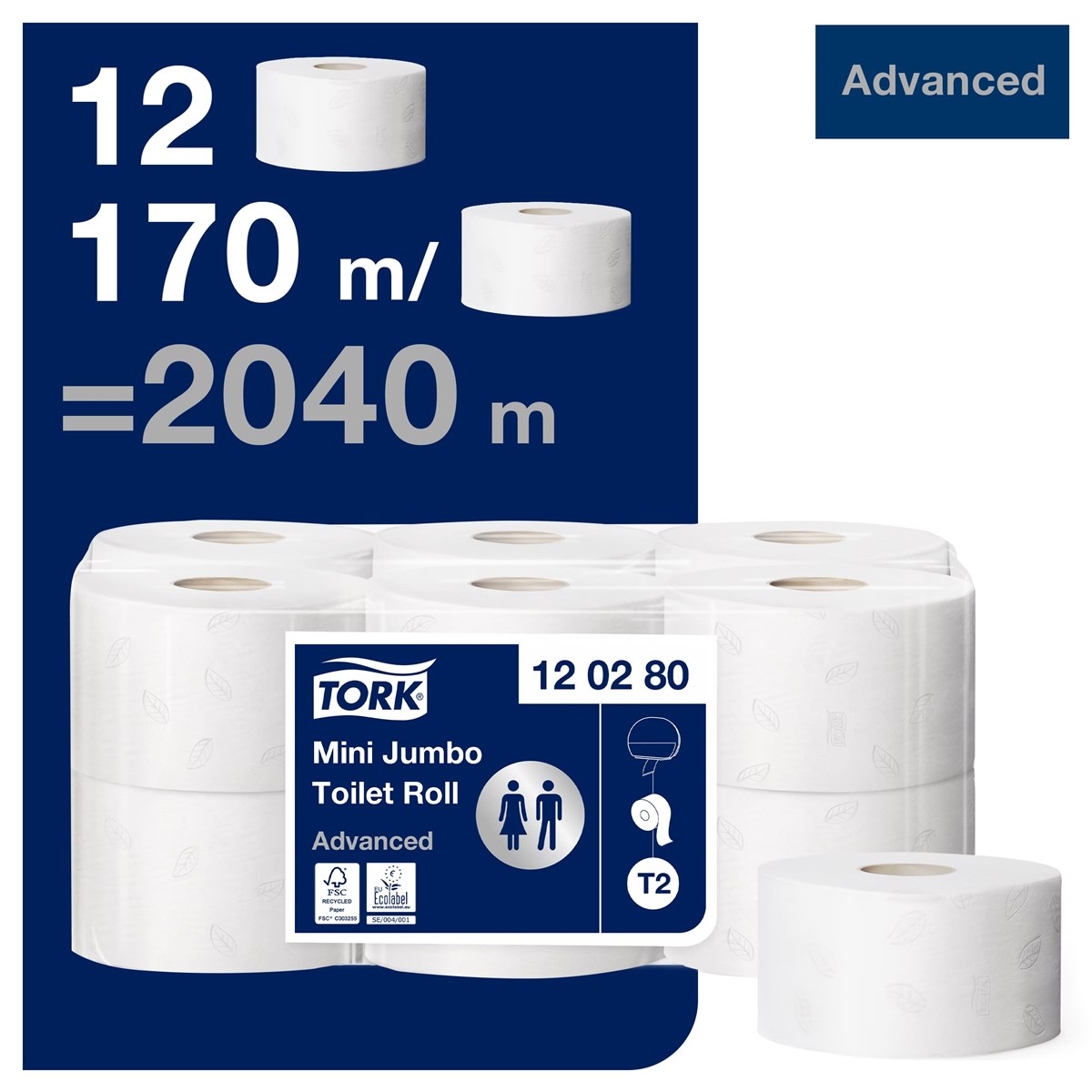 Vitt, 2-lag toalettpapper av god kvalitet (Advanced). Dekorprägling i grått. 170 m. 12 rl/förp. Passar till Tork hållare T2.